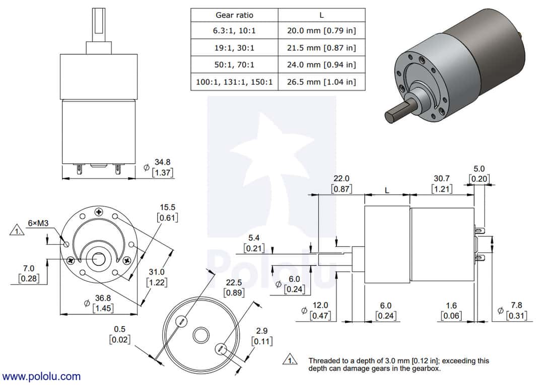 Motor, 6 mm D-şekilli çıkış mili ve 37 mm çapında