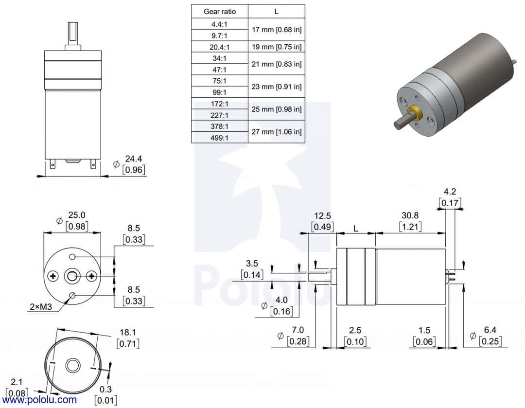 yapıya sahiptir; çapı yaklaşık 25 mm, D şeklindeki çıkış mili ise 4 mm çapında